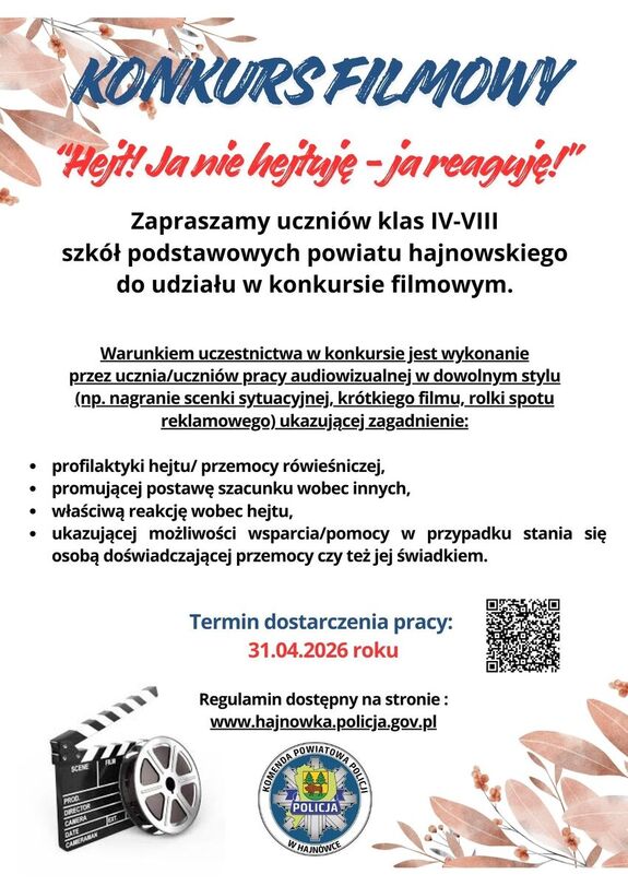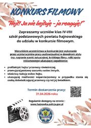 Zapraszamy do udziału w konkursie filmowym pt. "Hejt! Ja nie hejtuję - ja reaguję!". Konkurs skierowany jest do uczniów klas IV-VIII szkół podstawowych z powiatu hajnowskiego. Uczestnicy mają za zadanie wykonać pracę audiowizualną - nagrać scenkę, film, rolkę lub spot. Praca powinna ukazywać między innymi właściwą reakcję wobec hejtu oraz promować postawę szacunku wobec innych. Przed dostarczeniem zgłoszenia prosimy o zapoznanie się z załączonym Regulaminem konkursu oraz wypełnienie formularza RODO.