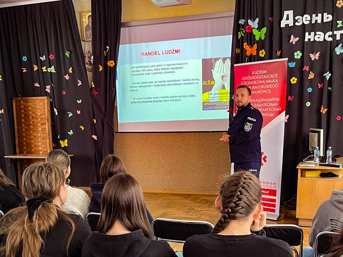 Przestępstwo handlu ludźmi jest formą współczesnego niewolnictwa. Proceder ten rażąco narusza podstawowe prawa człowieka, w tym do wolności i godności. Z okazji przypadającego jutro Europejskiego Dnia Przeciwko Handlowi Ludźmi mundurowi i profilaktyk z hajnowskiej Policji, w trakcie ostatniego tygodnia spotykali się z uczniami szkół średnich. Celem prelekcji było podniesienie świadomości młodzieży na temat zjawiska handlu ludźmi oraz umiejętności identyfikacji zagrożeń w tym obszarze. Policjanci mówili, że w obecnym świecie handel ludźmi istnieje i może dotyczyć każdego. Uczniowie z kolei wymieniali sposoby poszukiwania przez nich pracy, w tym również za granicą. Młodzież zwróciła także uwagę, jakie zagrożenia mogą być z tym związane. W trakcie spotkań policjanci przekazali wskazówki, jak powinno się planować wyjazd za granicę i jak należy postępować, aby nie stać się ofiarą omawianego procederu. Prowadzący spotkanie przedstawili techniki manipulacji, jakie stosują handlarze ludźmi, aby zbliżyć się do ofiary i zdobyć jej zaufanie. Przedstawiciele Policji podkreślali, że zawsze trzeba sprawdzić rzetelność pracodawcy i unikać przypadkowych propozycji pracy od nieznanych osób lub firm. Wskazali przy tym, gdzie młodzi ludzie mogą szukać pomocy, gdy staną się ofiarami.