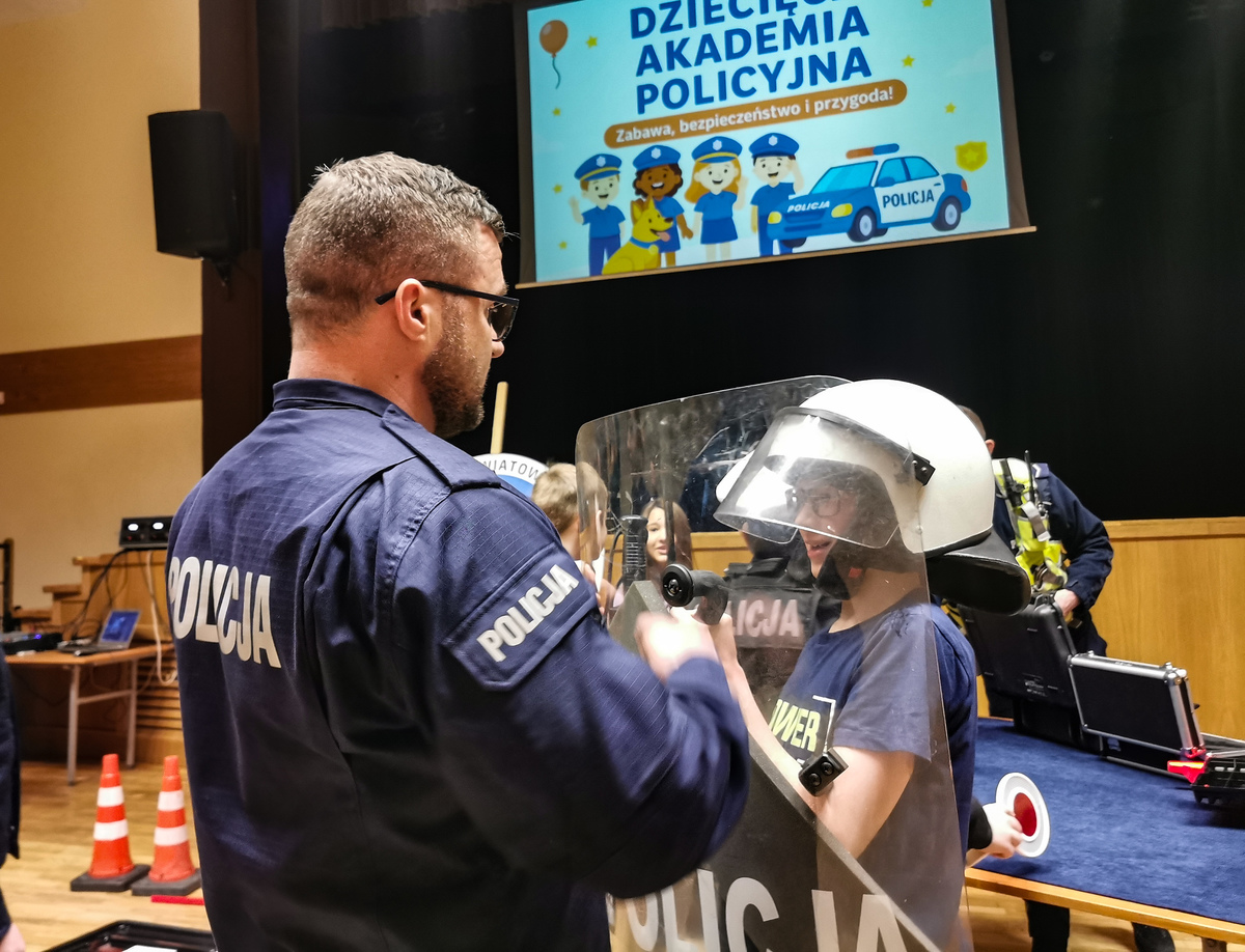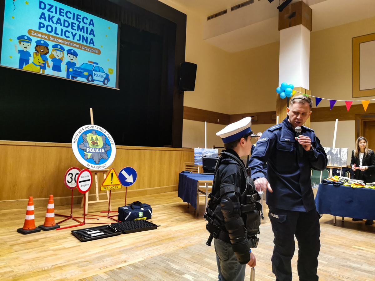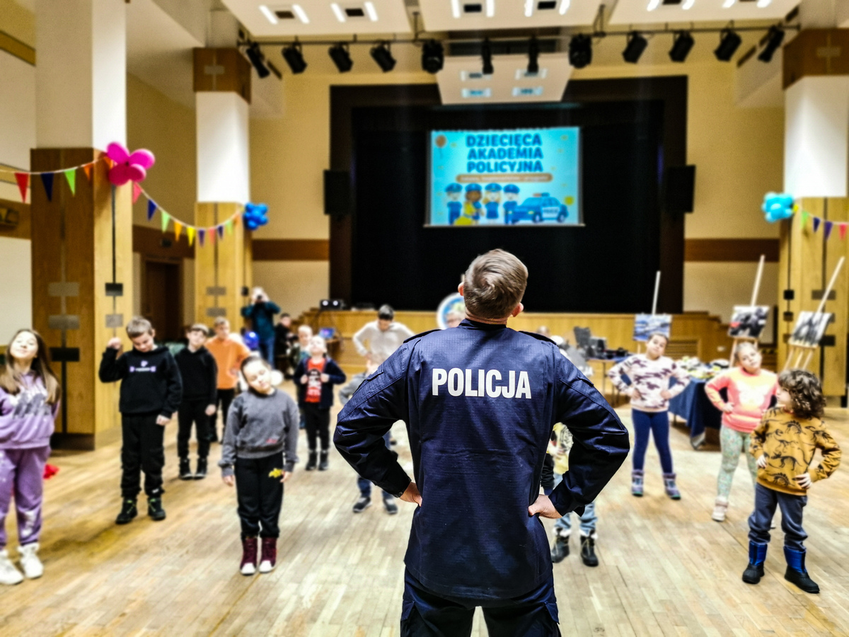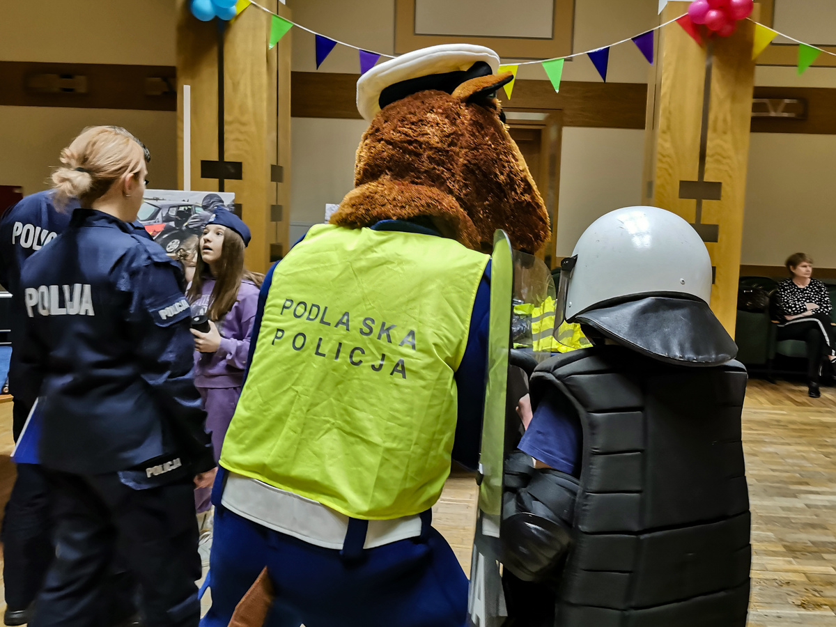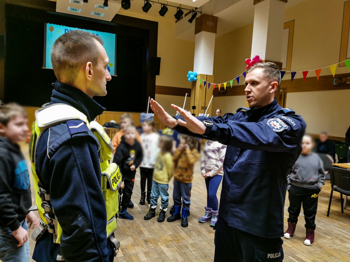 Dziś w sali kolumnowej Hajnowskiego Domu Kultury odbyła się Dziecięca Akademia Policyjna. Edukacyjne zajęcia dla dzieci zostały zorganizowane przez policjantów i profilaktyków hajnowskiej komendy oraz pracowników domu kultury. W trakcie wydarzenia nie zabrakło rozmów o bezpieczeństwie. Policjanci przypomnieli dzieciom między innymi jak dbać o bezpieczeństwo w trakcie zimowych zabaw. Mówili o tym, że podczas aktywności na śniegu, czy zjazdów na sankach wybierać należy miejsca bezpieczne, z dala od ruchliwych ulic i skrzyżowań. Policjanci apelowali o zachowanie szczególnej ostrożności w pobliżu jezdni, ponieważ zimą droga hamowania pojazdów jest znacznie wydłużona. Jedną z atrakcji, która czekała na dzieci były zajęcia ruchowe z policyjnym instruktorem. W trakcie wspólnych ćwiczeń mali adepci Akademii dowiedzieli się jak zareagować, gdy ktoś je zaatakuje. Na uczestników czekał również pokaz sprzętu służbowego, wykorzystywanego na co dzień przez policjantów. Dzieci mogły przymierzyć między innymi zestaw przeciwuderzeniowy wykorzystywany przez mundurowych w trakcie zabezpieczeń. Dużym zainteresowaniem cieszył się także miernik prędkości, z którego korzystają policjanci drogówki. Ogromną frajdę sprawił uczestnikom Akademii odblaskowy pokaz mody. Była to doskonała okazja do przypomnienia o tym, jak ważne jest noszenie elementów odblaskowych. Do wspólnej zabawy przyłączył się Komisarz Żubrewicz, który zagrał z dziećmi w quiz o bezpieczeństwie i każdemu z uczestników wręczył pamiątkowy upominek.